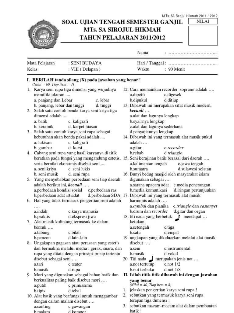 Contoh Soal Seni Budaya Kurikulum 2013 Kelas 10 Semester 2 / Latihan Soal Pat Seni Budaya Kelas 8 Smp Mts Kurikulum 2013 Pendidikan Kewarganegaraan Pendidikan Kewarganegaraan - Semester 2 part 2 melanjutkan contoh soal essay dan jawaban sejarah kelas x.
